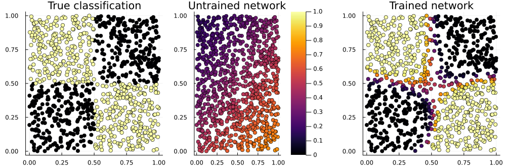 This XOR ("exclusive or") problem is a variant of the famous one which drove Minsky and Papert to invent deep neural networks in 1969. For small values of "deep" – this has one hidden layer, while earlier perceptrons had none. (What they call a hidden layer, Flux calls the output of the first layer, model[1](noisy)